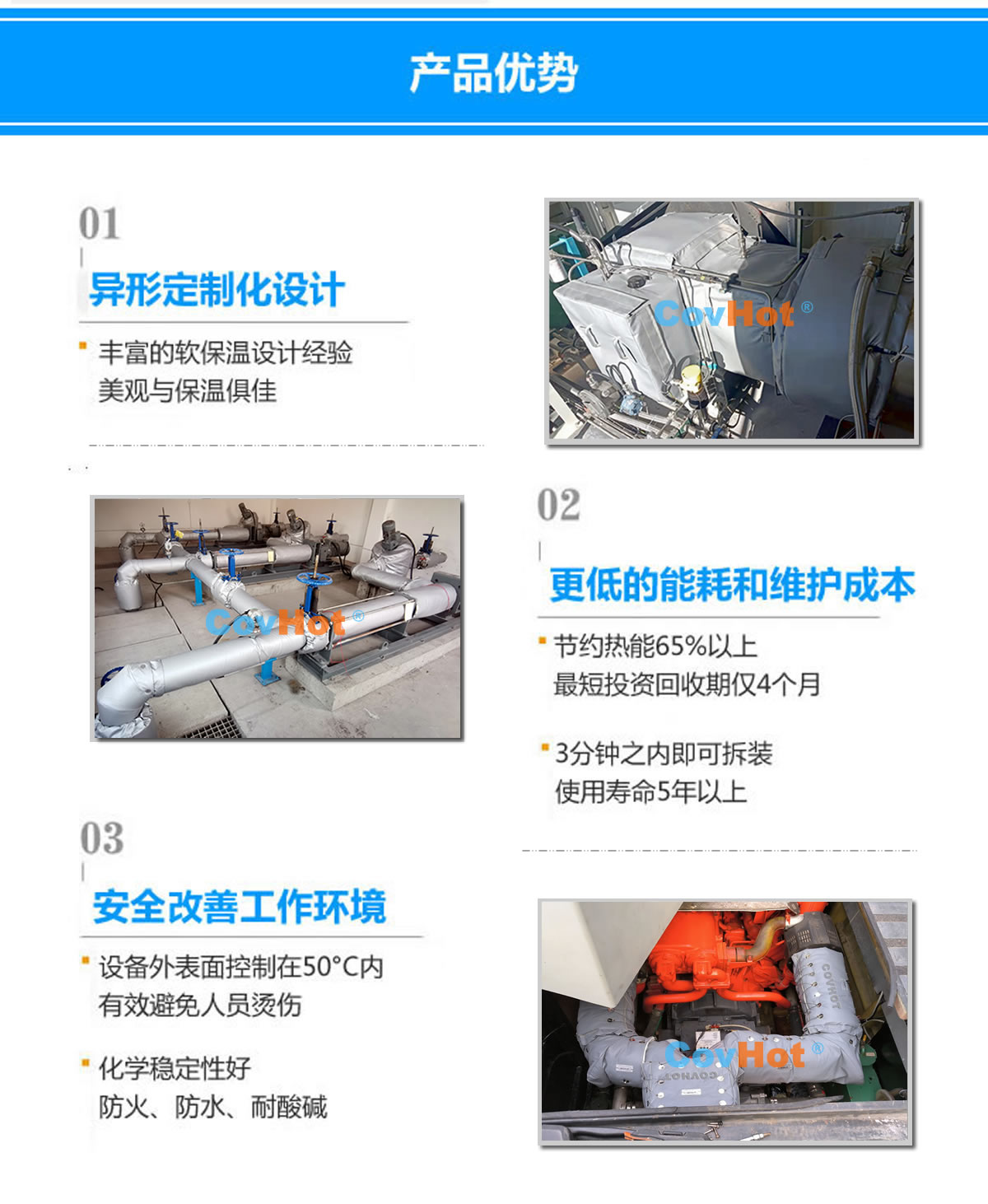 排氣管隔熱套具有易拆裝、可反復循環(huán)使用等特點,并且具有柔性,可根據(jù)排氣管的形狀,走向設(shè)計制作隔熱套,與排氣管貼合度高,包裹性強。能夠有效解決車輛排氣系統(tǒng)保溫隔熱難題。